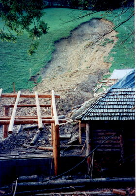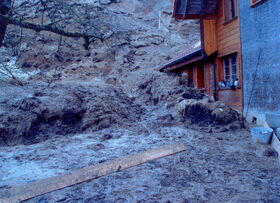 Les coulées de boue de versant (glissements spontanés) peuvent survenir sur des versants escarpés lorsque les couches souterraines présentent une stabilité amoindrie et qu’elles sont fortement détrempées. La masse de terre saturée d'eau se met alors subitement en mouvement. Le mouvement est très rapide en raison de la part élevée en eau, ce qui provoque un déplacement total du sol. L’action exercée sur le bâtiment est similaire au débordement de la lave torrentiel, mais les coulées de boue de versant sont plutôt constituées de matériaux fins.